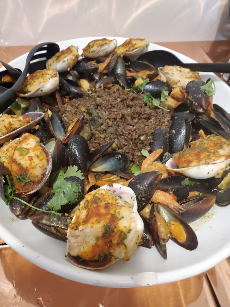 Chicken, steak and Haitian Black Mushroom Rice (Diri Djon Djon).
