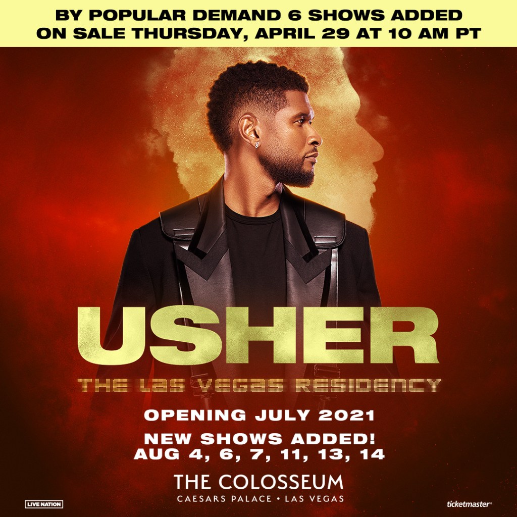 As he prepares to launch his headlining residency at The Colosseum at Caesars Palace on Friday, July 16, 2021, global megastar and eight-time GRAMMY® Award-winner Usher has announced six additional dates from August 4 to 14, 2021 for his Las Vegas residency.