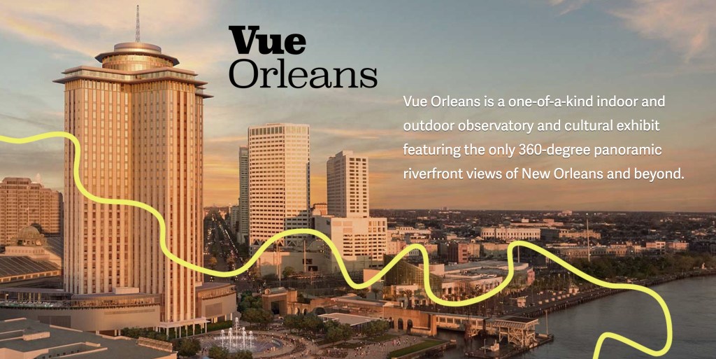 Opened in 2022, Vue Orleans is a one-of-a-kind indoor and outdoor observatory and cultural exhibit featuring the only 360-degree panoramic riverfront views of New Orleans and beyond. Bringing together hundreds of local historians, artists, musicians, Mardi Gras Indians, chefs, actors, filmmakers to collaborate and create a state-of-the-art experience, Vue Orleans offers a behind-the-scenes celebration of New Orleans’s unique culture. For more information, please visit www.VueOrleans.com and follow along on Facebook and Instagram.