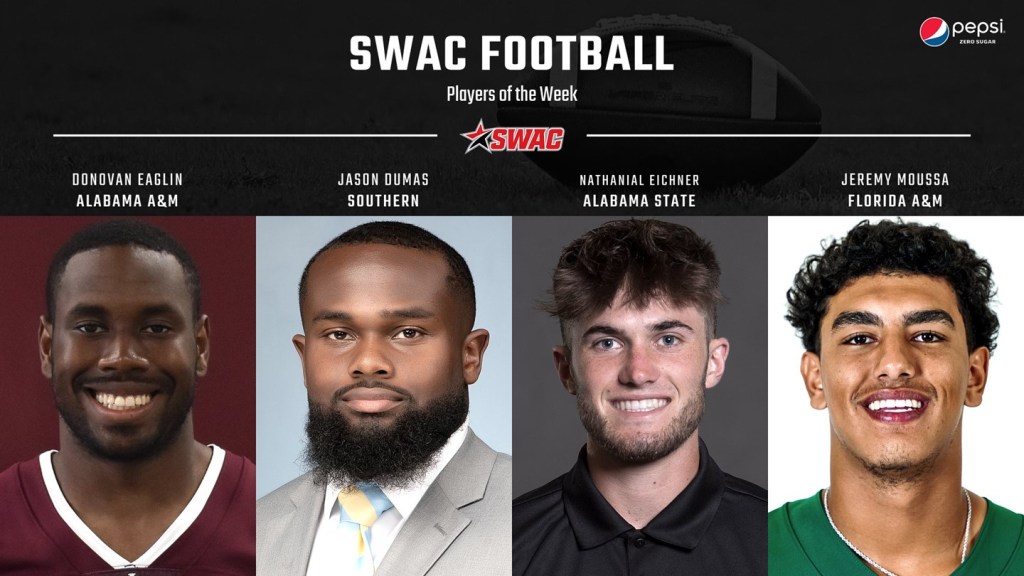 The Southwestern Athletic Conference has named Alabama A&M’s Donovan Eaglin, Southern’s Jason Dumas, Alabama State’s Nathanial Eichner and Florida A&M’s Jeremy Moussa its SWAC Football Players of the Week for their impressive performances during games played this past week of competition.