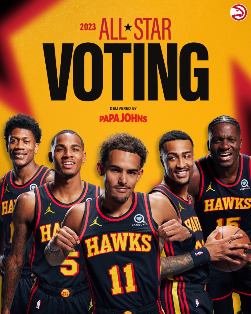 As part of today’s league-wide launch of NBA All-Star Voting, the Atlanta Hawks launched their 2023 All-Star Voting delivered by Papa Johns, in which fans can begin voting today, Tuesday, Dec. 20 and every day through Saturday, Jan. 21, 2023. Fans are encouraged to vote for their favorite Hawks players such as Clint Capela, John Collins, De’Andre Hunter, Dejounte Murray and Trae Young at Hawks.com/AllStar or through the new NBA App and NBA.com.