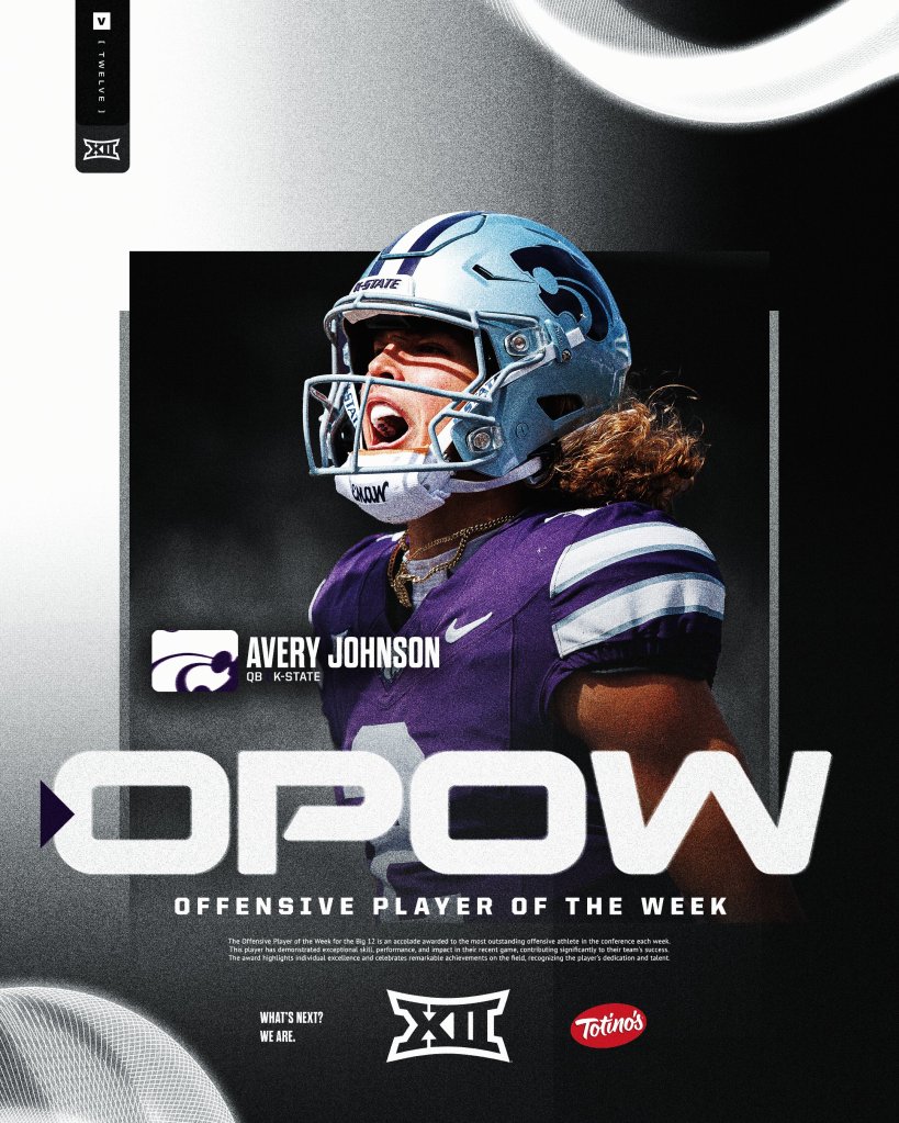 Johnson accounted for five touchdowns in the Wildcats’ win over then-No. 20 Oklahoma State, becoming the first K-State QB to have three passing touchdowns and two rushing scores in a Conference game since Collin Klein in 2012. The 42-20 victory came in Johnson’s sixth career start as he threw for 259 yards and rushed for 60 yards to give Kansas State its second top 25 win of the season. Through five weeks of the season, Johnson is the only Big 12 quarterback to throw for 800 or more yards and rush for over 300 yards.