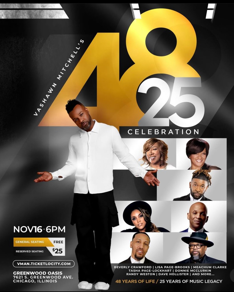 7x Stellar Award-winner and 2x Grammy-nominated Billboard-topping Chicago-native artist, VaShawn Mitchell, will be hosting a star-studded birthday celebration concert celebrating 25 years in the music industry! This “25 Years of Music” celebration will take place on Saturday, November 16 at Greenwood Oasis starting at 6pm. Special performances of the night include the viral sensation Lisa Page Brooks (“Yeah yeah yeah yeah”), Beverly Crawford (“He’s Done Enough”), Tasha Page Lockhart (BET Sunday Best Season 6 Winner / WEtv’s Grown and Gospel), Meachum Clarke, Randy Weston (“For My Good”), famed R&B crooner Dave Hollister (“One Woman Man”) and 3x Grammy Award-winning icon, Donnie McClurkin (“Stand”/“We Fall Down”). There will also be an exciting reunion of two choirs that have played an integral role to his career: Bishop Larry Trotter and Sweet Holy Spirit Choir and New Image Chorale. Aside from Mitchell’s own award-winning catalog including “Nobody Greater”, “Turning Around for Me” and “Joy”, this night is sure to be a night filled with great memories and music.