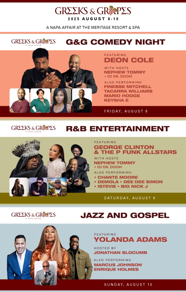 The lineup is heating up for Greeks & Grapes: A Napa Affair, a four-day luxury cultural celebration that’s redefining Napa Valley’s wine scene with the addition of powerhouse performances from Yolanda Adams, Finesse Mitchell and Tacarra Williams to a stellar lineup of previously announced juggernauts including George Clinton, Nephew Tommy and many more. The event, set for August 7–10, 2025, at The Meritage Resort and Spa, promises a first-of-its-kind fusion of Black excellence, music, comedy, wine and curated indulgence.