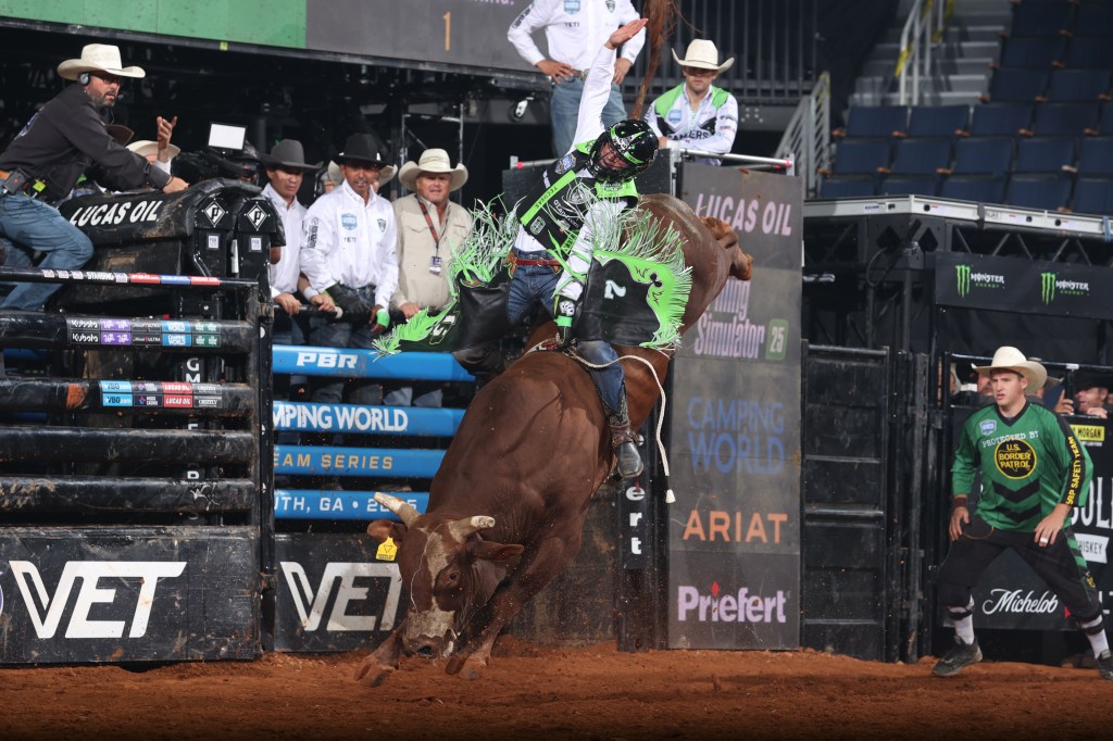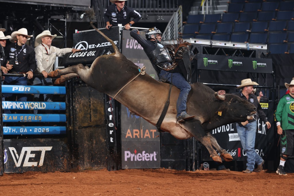 Action inside Gas South Arena began with the New York Mavericks playing the Oklahoma Wildcatters. Backed by key scores from Cort McFadden and Kyler Oliver, the Wildcatters outlasted the Mavericks by one point, 175.25-174.25, to earn the team’s first game win of the 2025 PBR Teams season. Both teams are now 1-4 across 2025, and Oklahoma overtook New York for the No. 9 rank in PBR Teams.