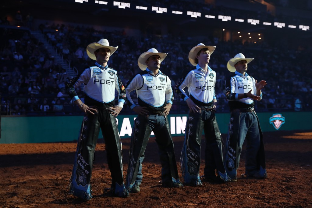 Austin Gamblers — Sage Steele Kimzey rides Milestone for 82.5 points, keeping the score despite being offered a re-ride; Dener Barbosa rides Rank Hank for 84.75 points; Andrei Scoparo bucks off Pneu-Dart’s Chief Wahoo in 6.67 seconds; Dalton Kasel bucks off Rockville in 2.47 seconds; Jose Vitor Leme rides Bad Bob for 86.5 points.