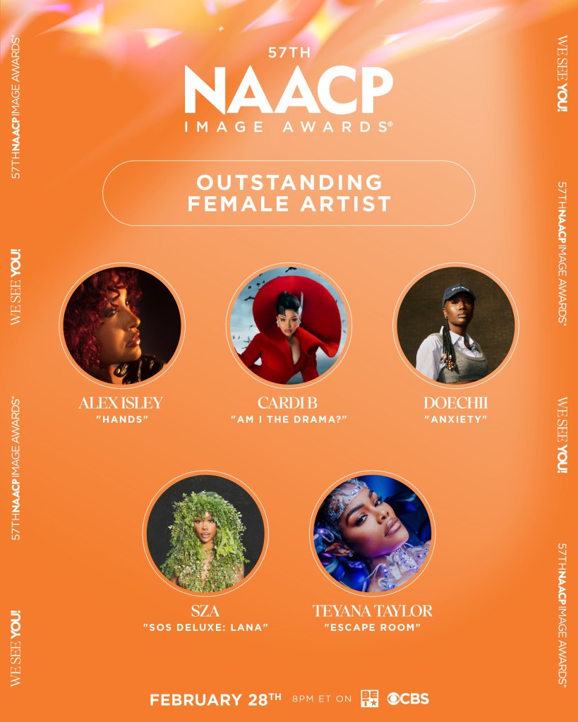 Today, the NAACP announced the full list of “57th NAACP Image Awards” nominees, with Cynthia Erivo, Doechii, Kendrick Lamar, Michael B. Jordan and Teyana Taylor nominated for Entertainer of the Year. Select categories will be revealed during the two-hour LIVE TV special, airing Saturday, February 28, 2026, from the Pasadena Civic Auditorium, at 8 PM ET/8 PM PT on BET and will simulcast on CBS Television Network. This year’s theme is “We See You.”